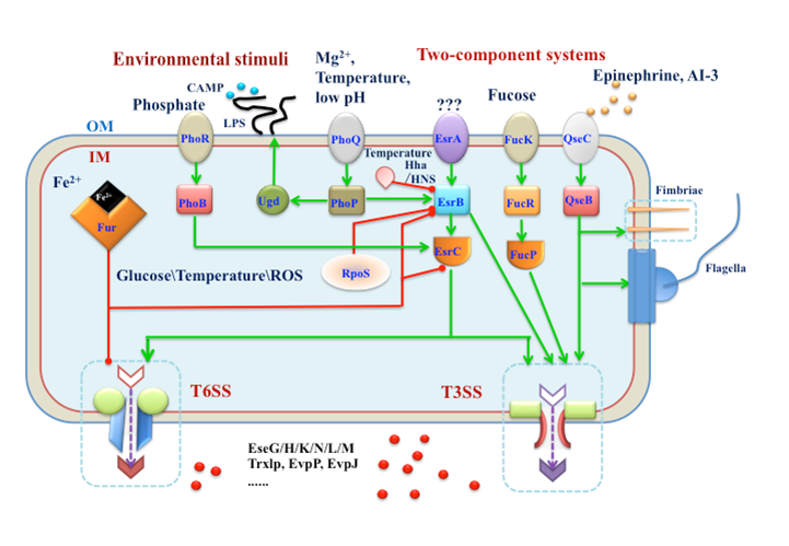 围绕着海水养殖业主要病害,365官网相关课题组紧扣“病原菌如何感知水产养殖环境和鱼类宿主生理变化并进行条件致病”主题,较为系统研究了相关病原菌感知包括温度、渗透压、pH、盐离子等鱼体内、外多种理化和生理信号变化并协调其中主要毒力系统T3SS和T6SS等表达和相关效应蛋白分泌的分子机制(图2),基本阐明造成鱼类病害发生的机理,并进行了减毒活疫苗的理性分子设计,相关研究成果发表在《iScience》、《Proceedings of the National Academy of Science of the United State of America》、《PLoS Pathogens》、《mBio》、《Environmental Microbiology》和《Virulence》等主流期刊,并获得多项国家发明专利授权和国家一类新兽药证书,相关疫苗产品也获得产业化应用,推动了我国海水养殖鱼类免疫防治体系的构建。